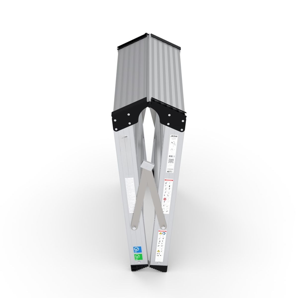 Den dubbelsidiga uppstigningen gör det enkelt att ta sig upp oavsett arbetsposition. De räfflade stegen och glidsäkra fötterna ger ett säkert grepp på olika typer av underlag. Konstruktionen är välbalanserad och pålitlig, även när du arbetar på ojämna ytor eller byter position ofta.
