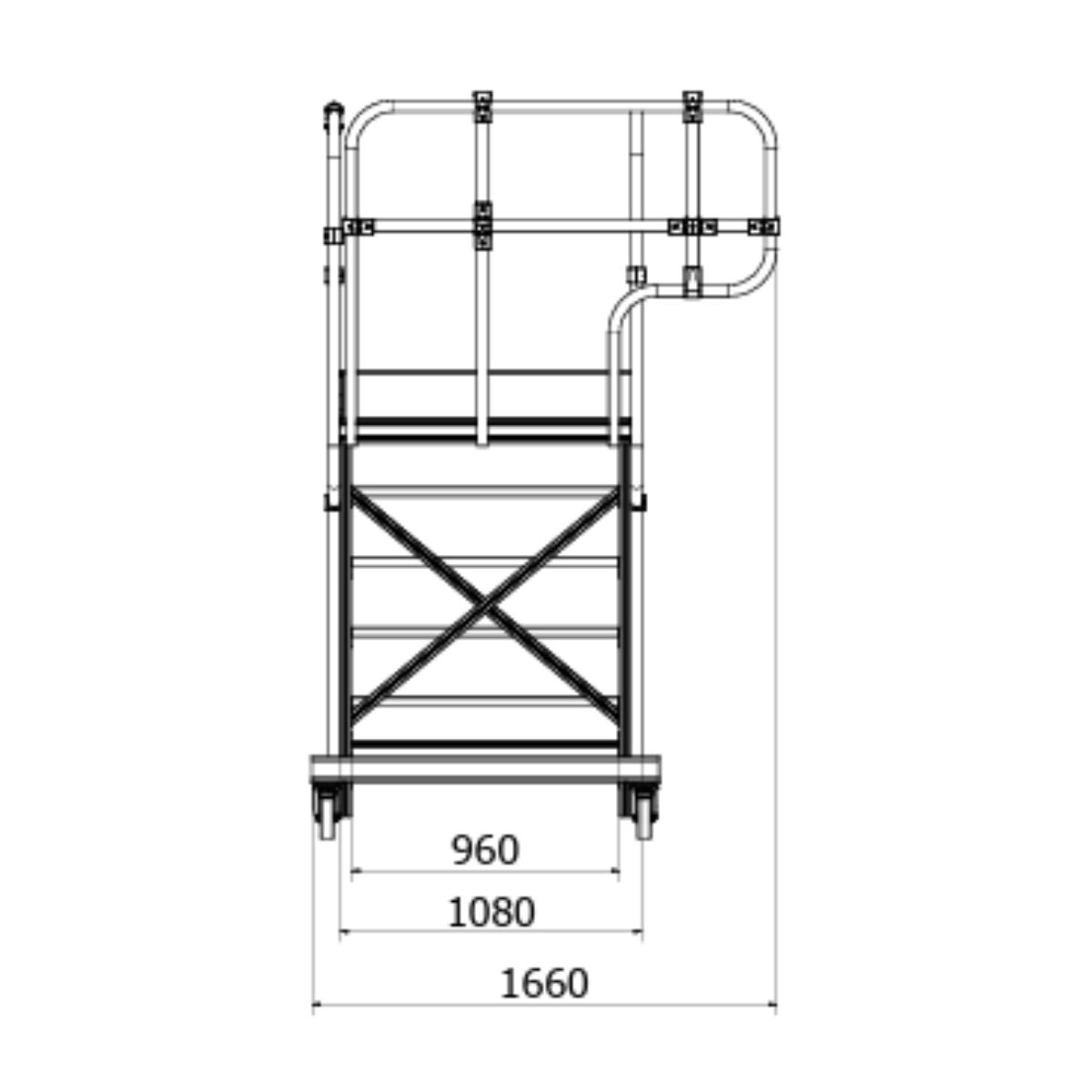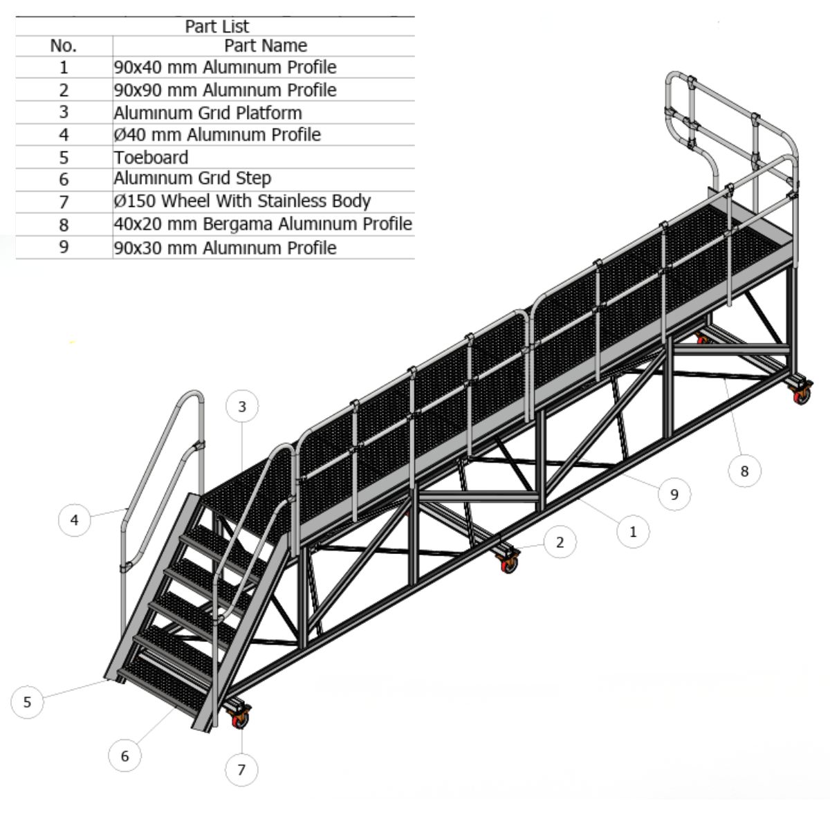 Arbetsplattformen är tillverkad i aluminiumprofiler med förstärkta tvärstag för maximal stabilitet. Räcken och trappa ger trygg åtkomst till plattformen, och den halksäkra gallerdurken säkerställer säkert fotfäste även i våta eller frusna miljöer.