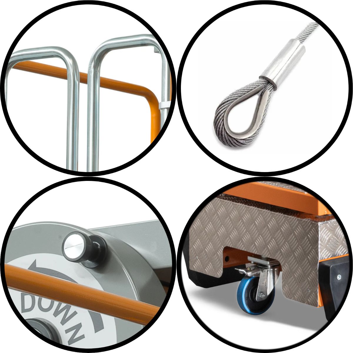 Operatören står tryggt på en inhägnad plattform med automatiska bromsar, nödsänkning, verktygshylla och saloon-dörrar. Ingen el, inga batterier och inga hydrauliska system innebär i princip noll underhåll, samtidigt som risken för driftstopp elimineras.