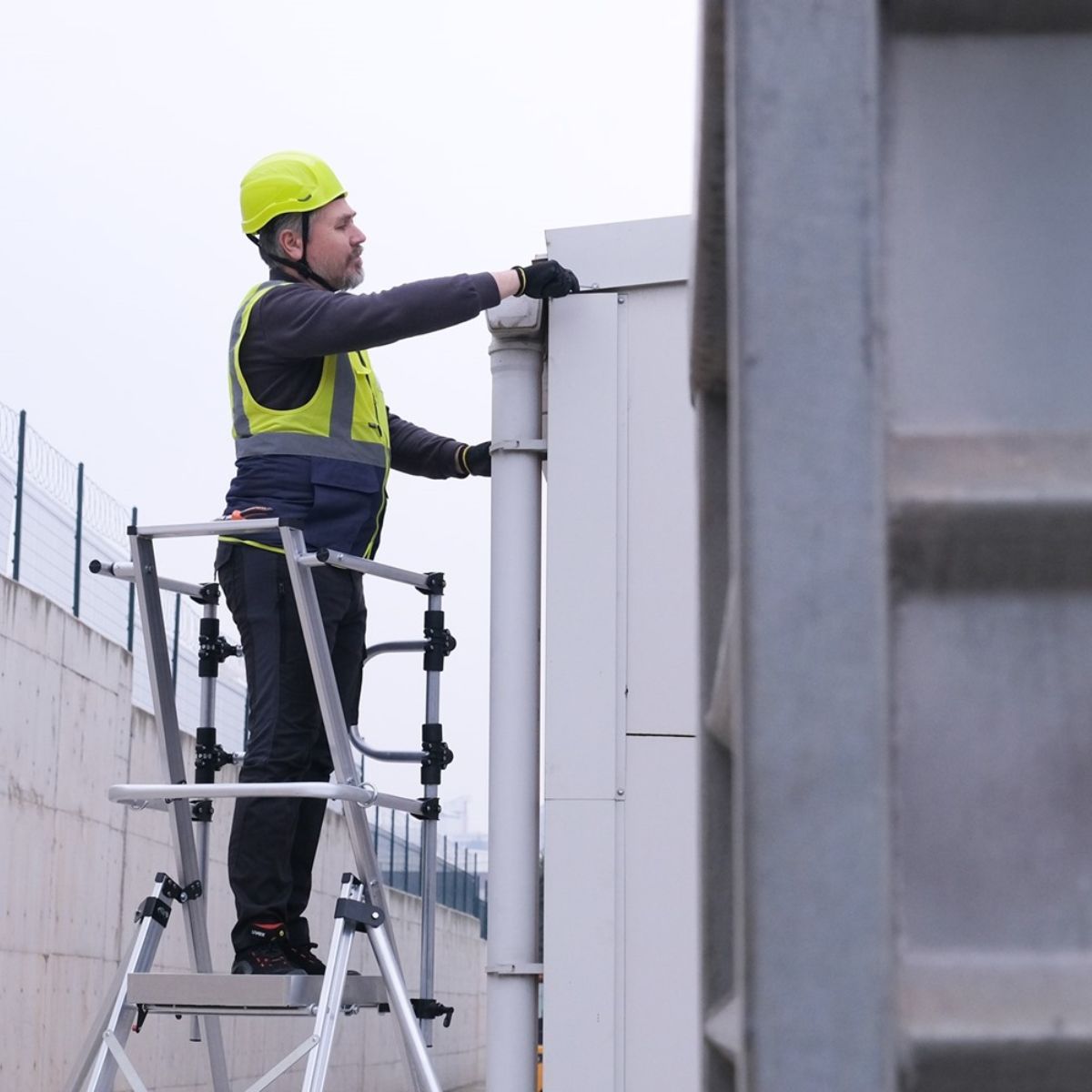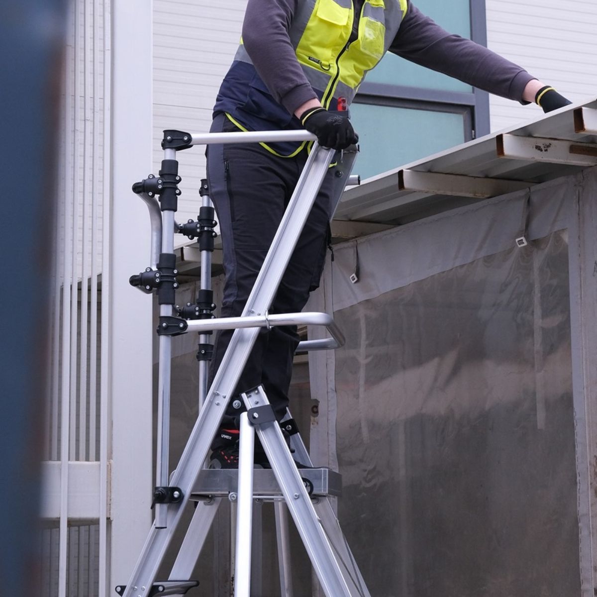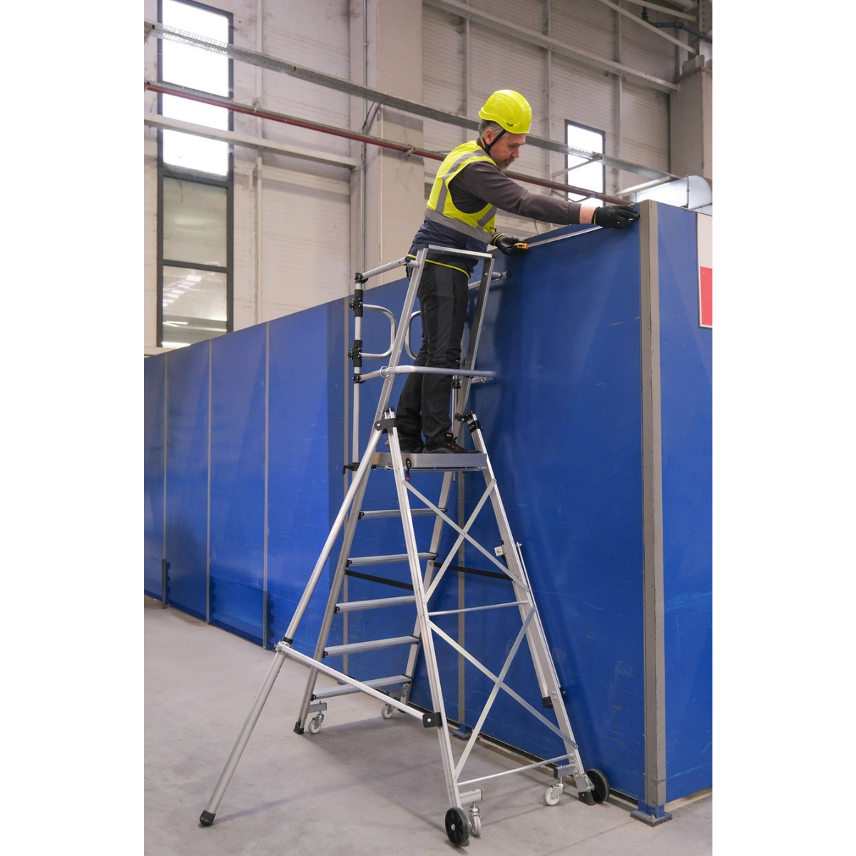 Plattformsstege med hjul Nova är utvecklad för yrkesproffs inom bygg, industri och service där stabilitet och mobilitet är avgörande. Den robusta aluminiumkonstruktionen kombinerar låg vikt med hög hållfasthet, vilket gör stegen enkel att hantera samtidigt som den klarar krävande arbetsmiljöer.