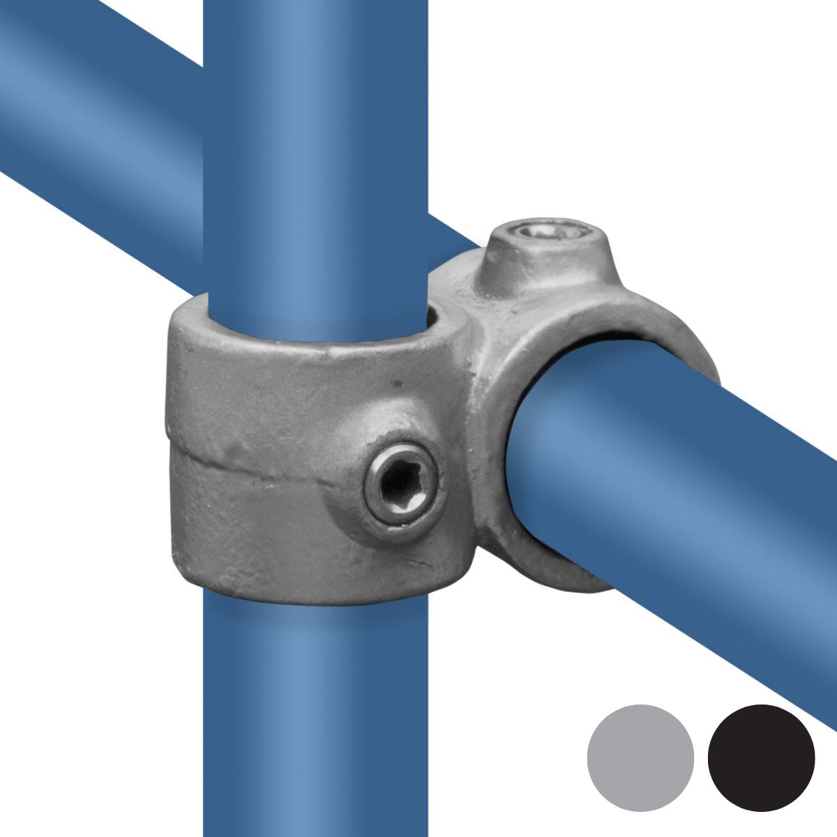 Monteringen är enkel: huvudröret löper rakt igenom kopplingen, medan det anslutande röret förs in i den utanpåliggande öppningen. Båda låses säkert med insexskruvar, vilket ger en fast och vibrationssäker konstruktion. Ingen svetsning eller avancerade verktyg behövs.