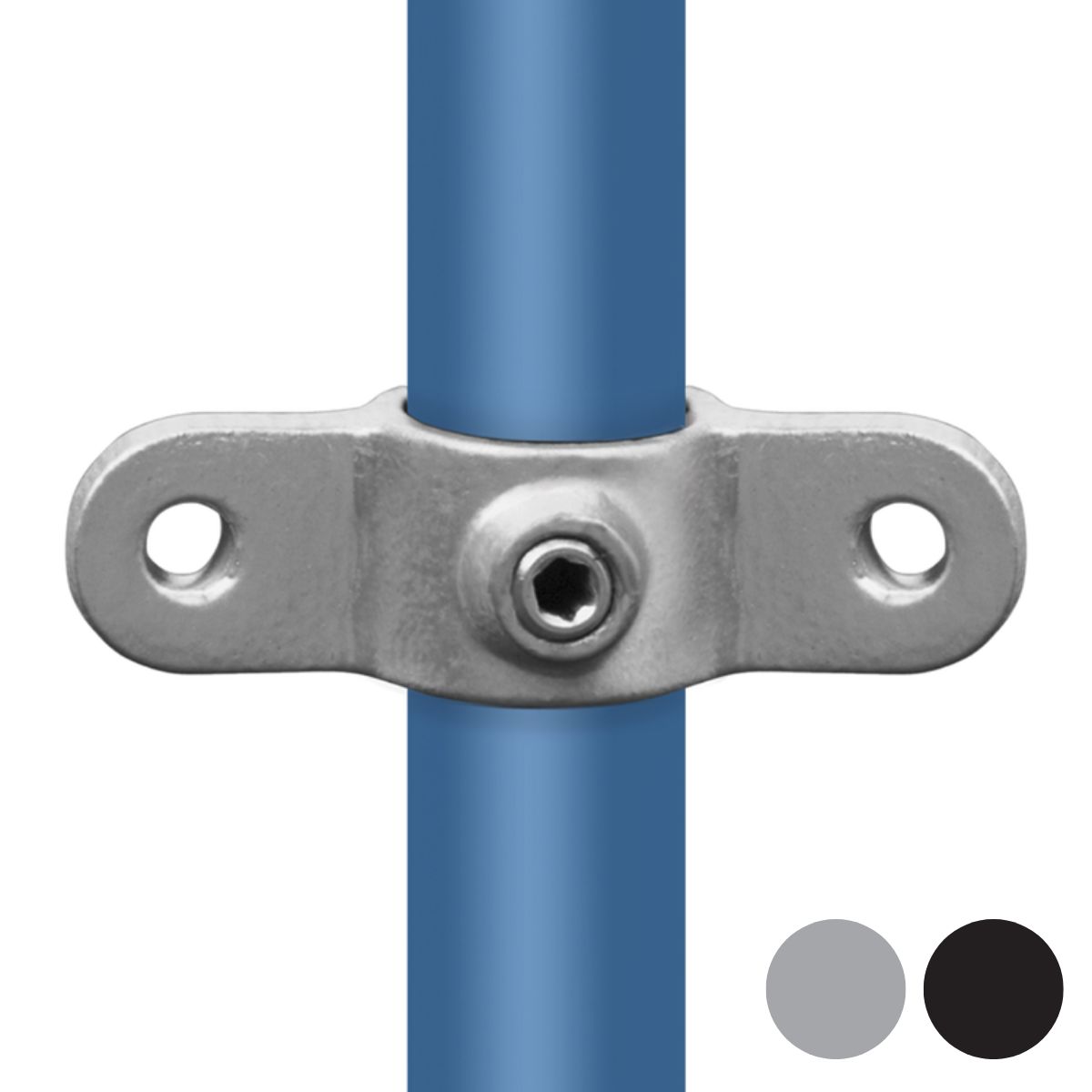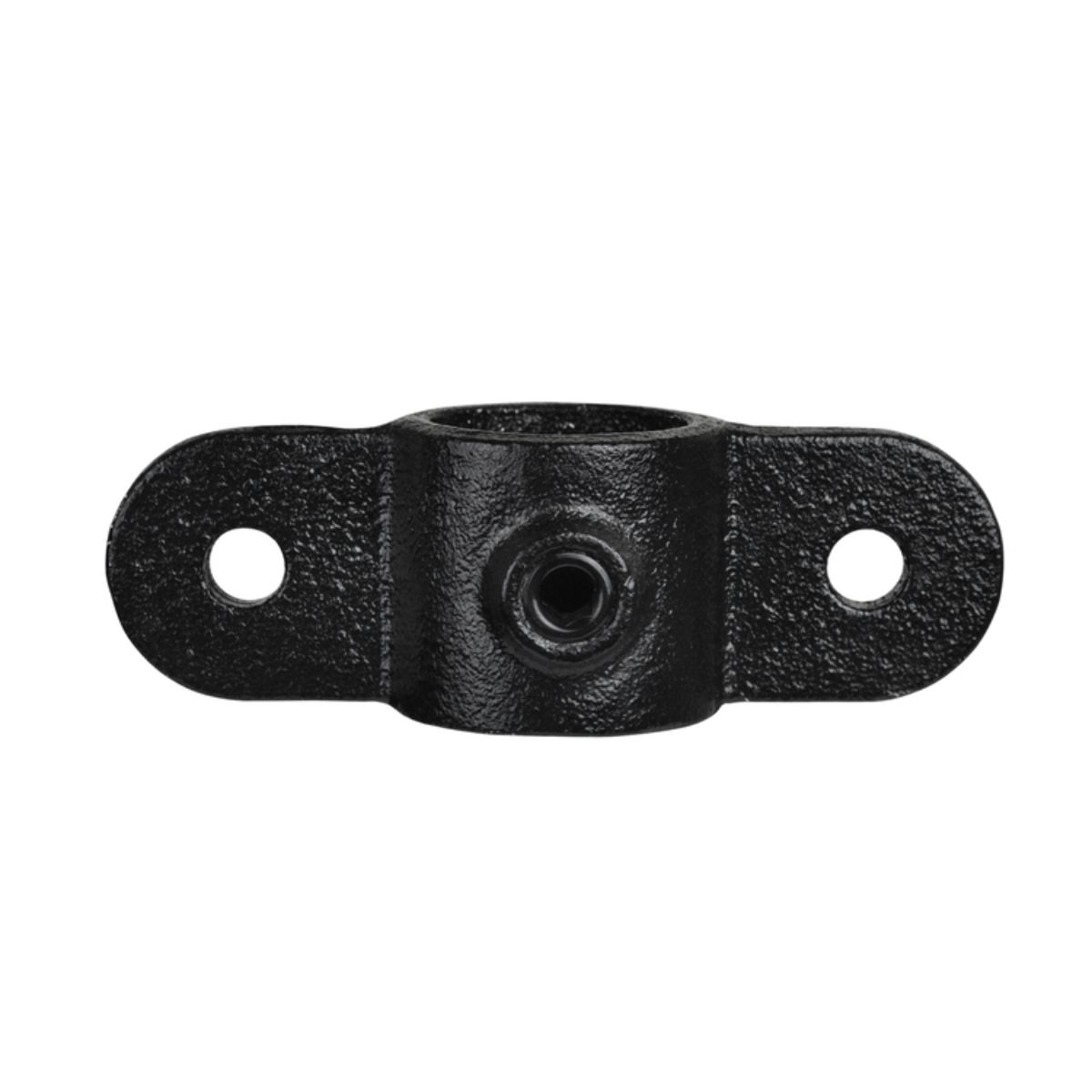 Kopplingen monteras runt röret och låses med insexskruv. De två fästöronen används för att skruva fast kopplingen mot underlag eller konstruktion, vilket ger en stabil och vibrationssäker infästning.