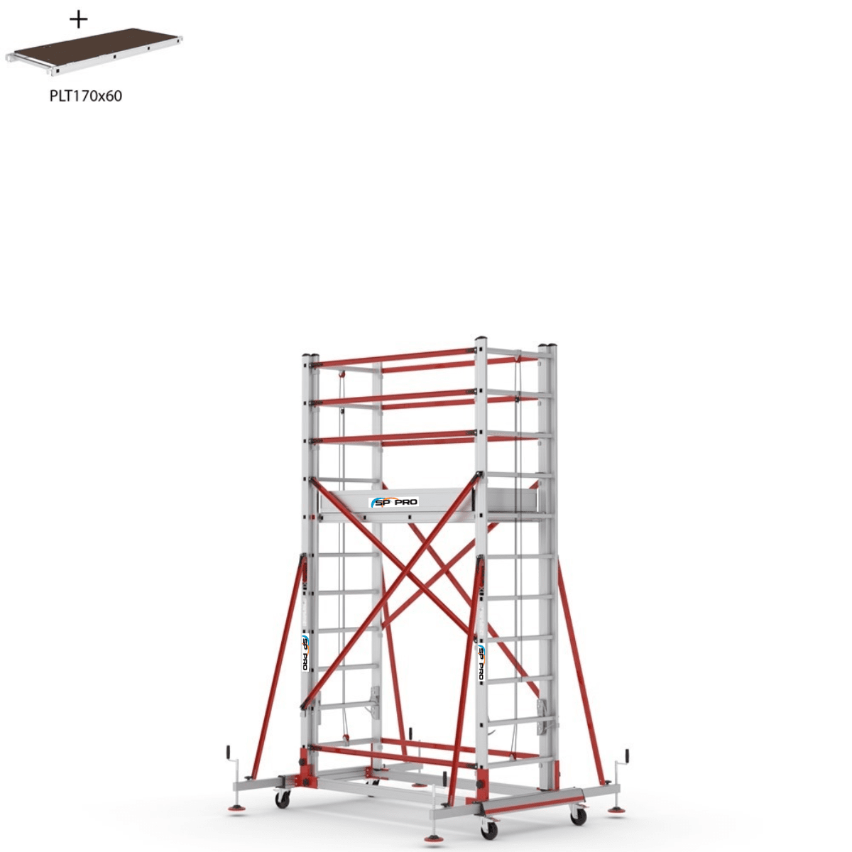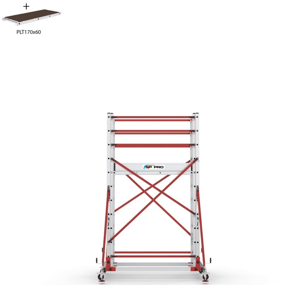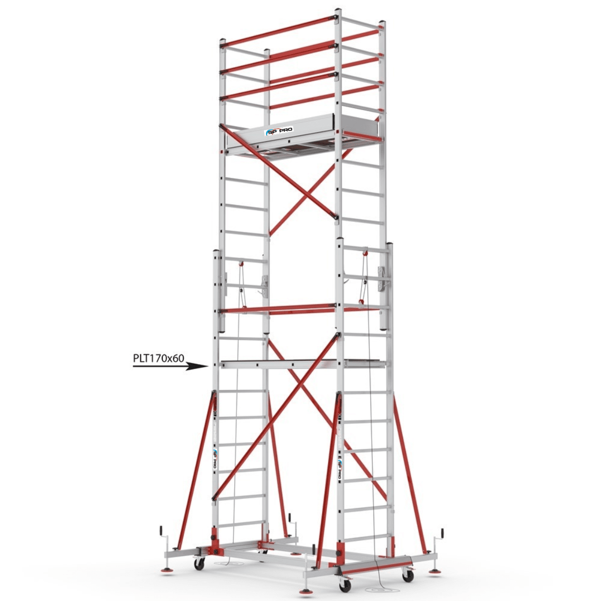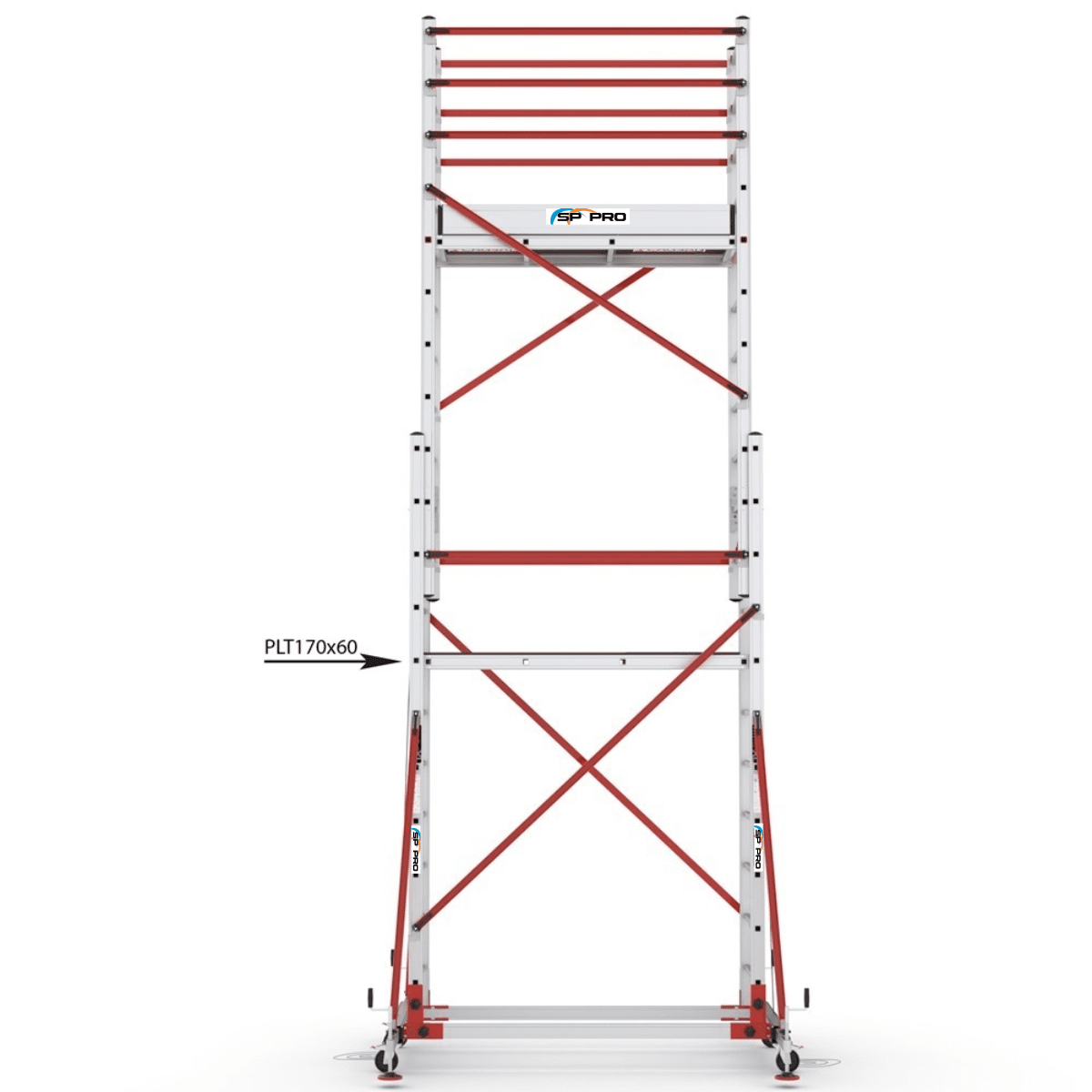 S006XLNPR använder en tvådelad aluminiumram där huvudstommarna binds samman med horisontella och diagonala aluminiumstag. Stålförstärkta stödben ger extra sidstabilitet, och plattformen i 12 mm väderbeständig plywood är utrustad med invändig lucka för säker uppgång. Med 110 cm skyddsräcken runt hela arbetsytan skapas en trygg och ergonomisk miljö även på högre nivåer.