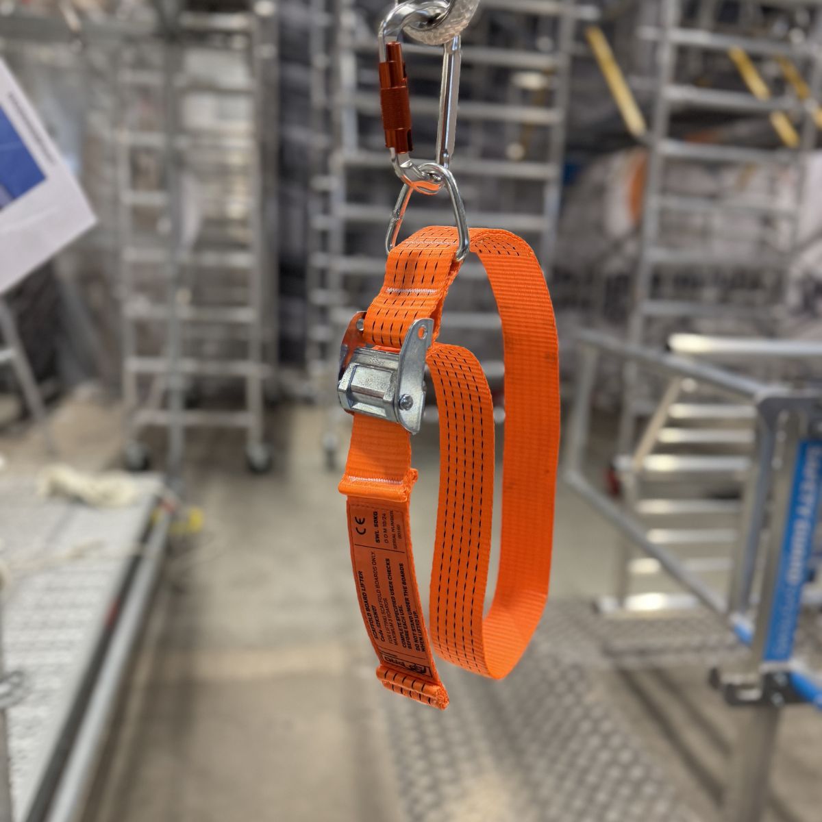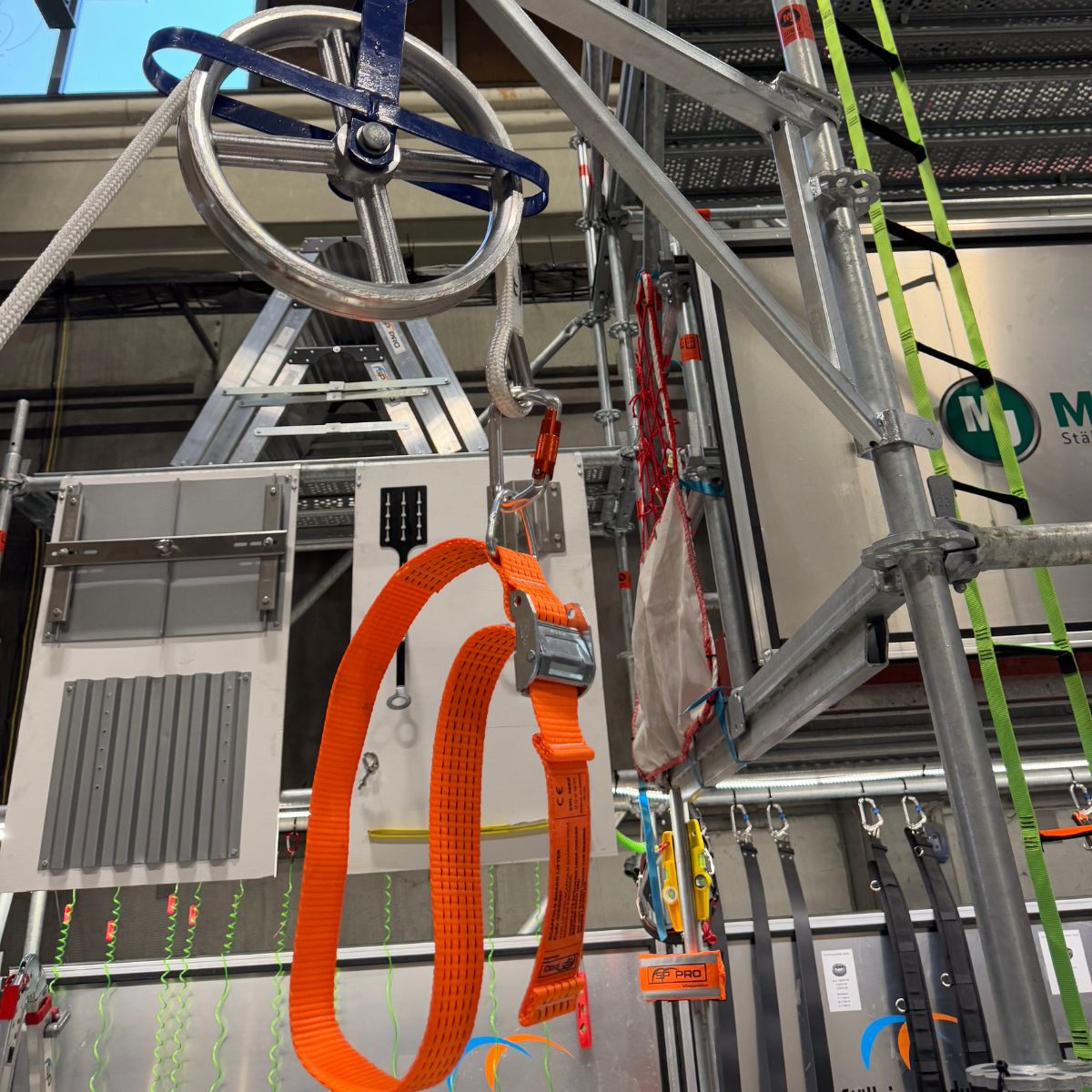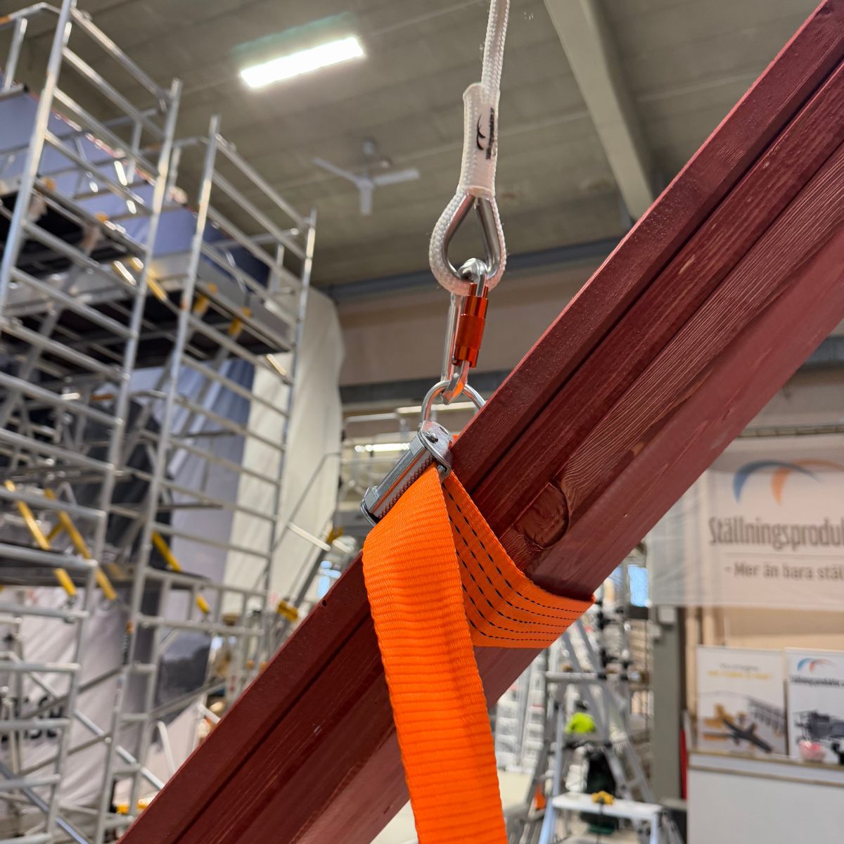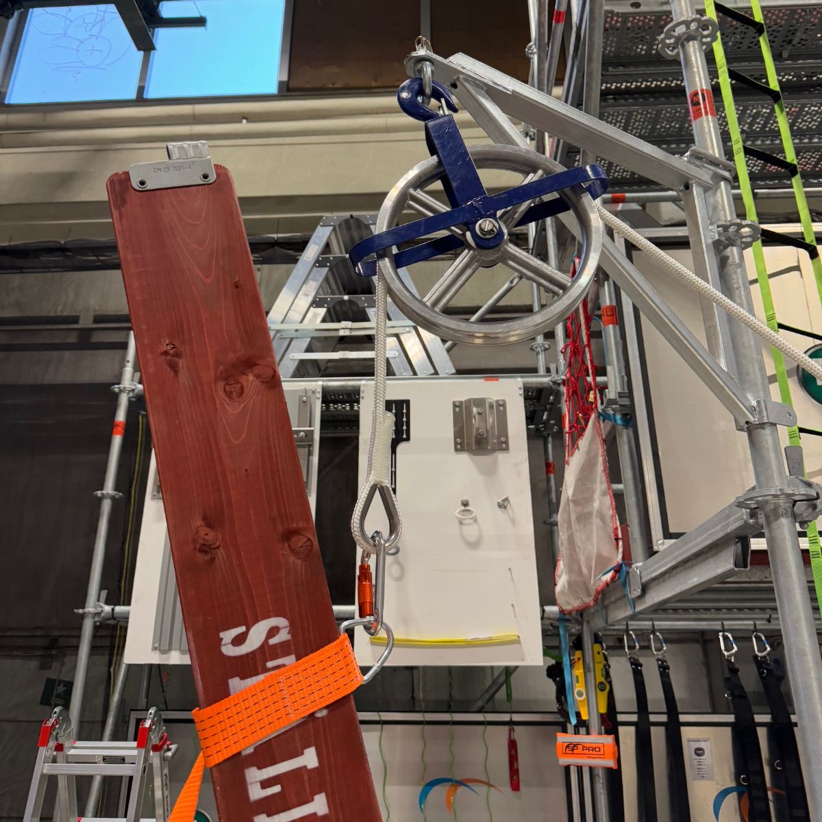 Ställningsvinsch Paket är ett komplett lyftsystem designat för att effektivisera upp- och nedfirning av material vid ställningsbyggen. Paketet inkluderar nu även en spännrem för vinsch och en karbinhake, vilket gör det helt komplett för att vinscha material tryggt och säkert. Detta tillägg säkerställer att materialet hålls stabilt och fast under hela lyftprocessen.