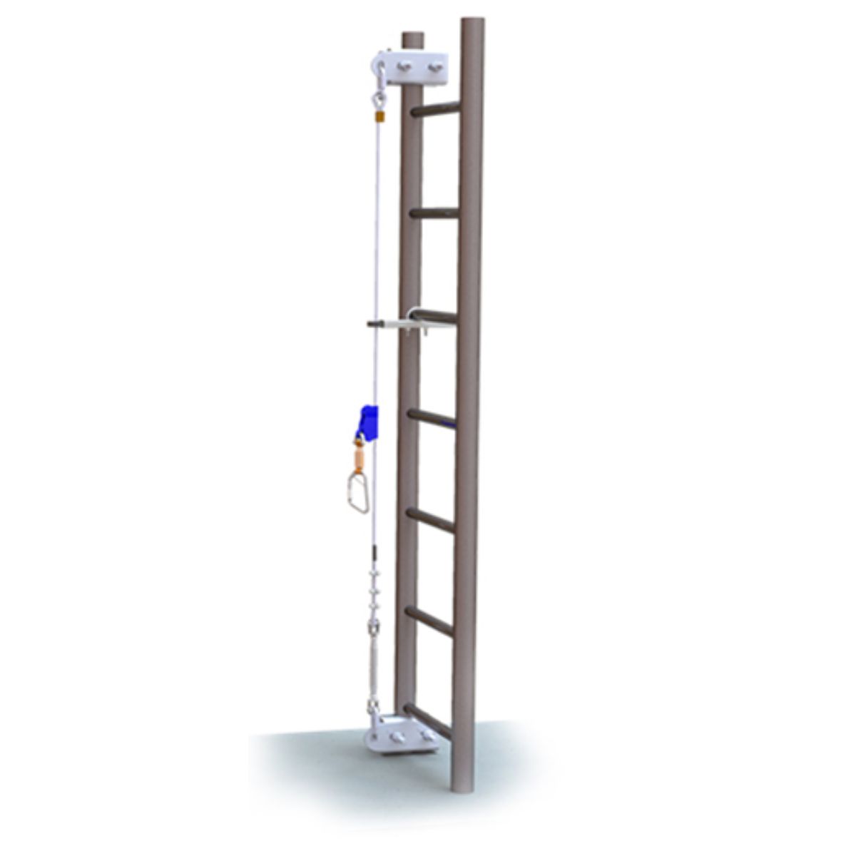 Detta Vajersystem för stege 6m är ett robust och komplett vertikalt vajersystem utvecklat för fasta stegar där arbetshöjden är större och kraven på fallskydd ännu högre. Den rostfria konstruktionen ger systemet en utmärkt motståndskraft mot korrosion och mekaniskt slitage. Systemet levereras med universalfästen som gör installationen enkel på våra fasadstegar.