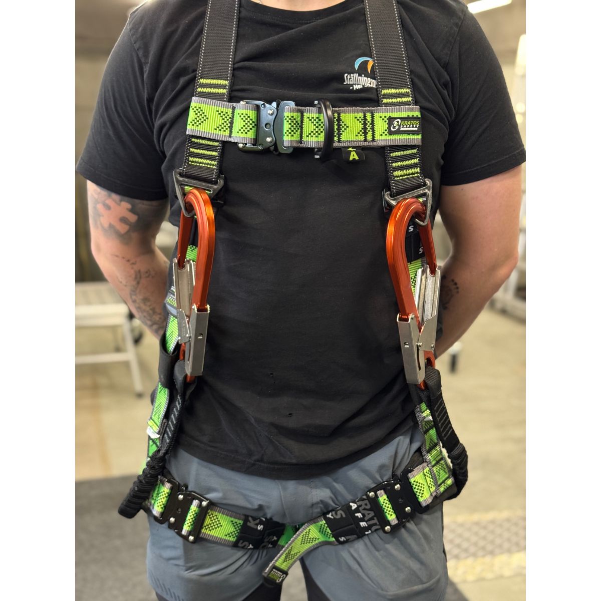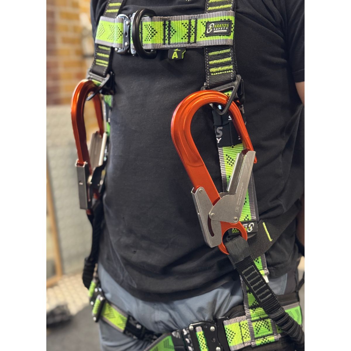 Med två stora hajkrokar på 61 mm öppning kan användaren snabbt och säkert fästa sig vid olika typer av förankringssystem. Karbinerna är tillverkade av aluminiumlegering, vilket minskar vikten och gör produkten lätt att hantera under långa arbetsdagar.