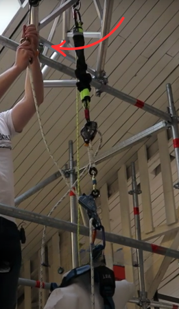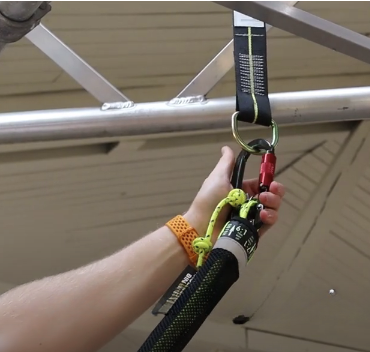 Dra åt "Hauler Biner" för att avlasta den hängandes från sitt eget fallskyddsrep till räddningskitet.