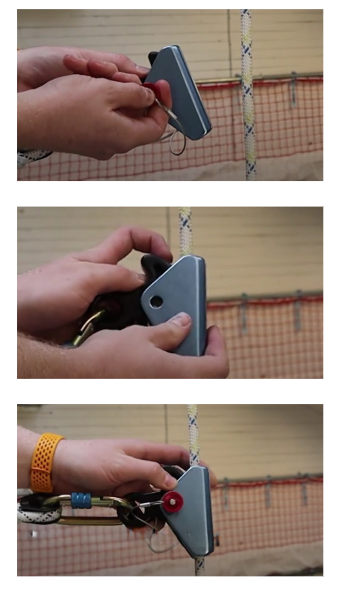 Öppna sprinten och placera den nödställdes fallskyddsrep mellan de två delarna av klämman. Sätt i sprinten.