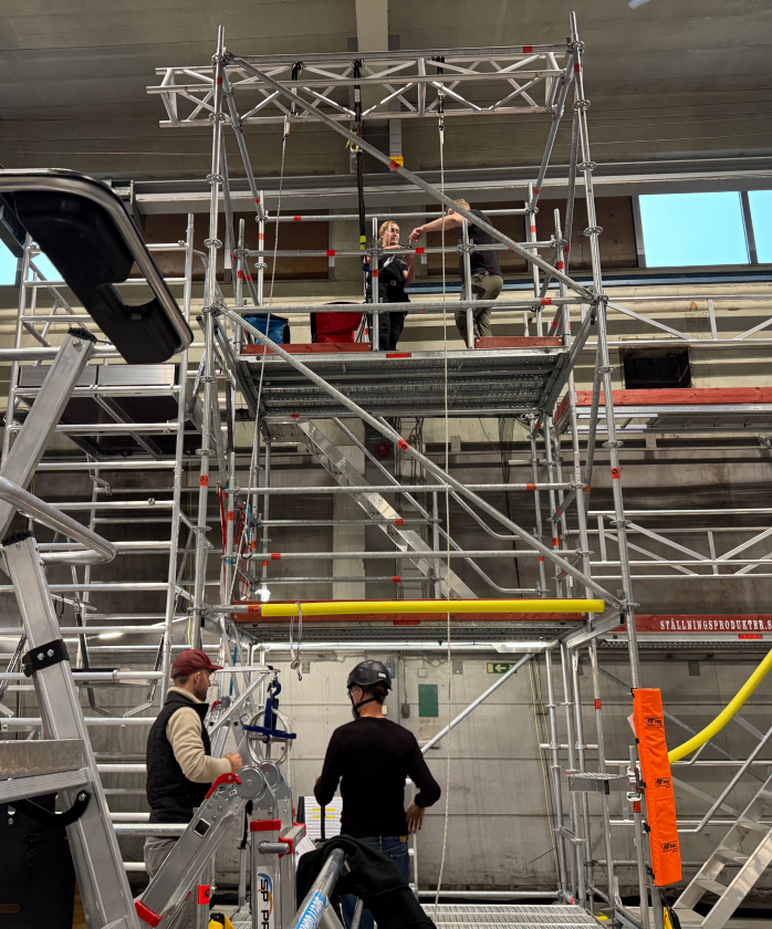 Under besöket gick vi igenom hela kedjan, från hur räddningskitet är uppbyggt till hur en säker och kontrollerad räddning ska genomföras i praktiken. Vi pratade om hur fallskyddsutrustningen används steg för steg, vad man behöver tänka på i stressade situationer och hur tydliga rutiner skapas så att alla vet vem som gör vad om en incident skulle inträffa. Genomgången tog även upp hur man kan minska riskerna vid arbete på höjd genom rätt förberedelser och ett konsekvent säkerhetstänk.