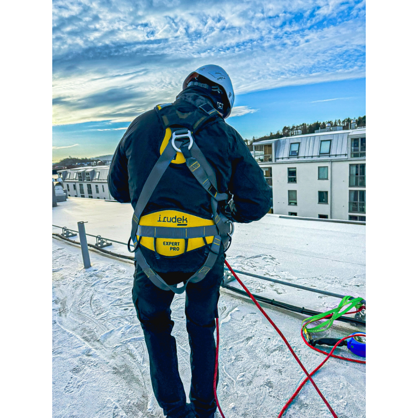 Vi rekommenderar starkt att alltid använda fallskyddspaket med rep eller block vid snöskottning. Dessa ger dig både rörelsefrihet och skydd när du arbetar på taket. Genom att hålla linan spänd eller använda block med automatisk inbromsning kan du minska risken för fall även i svåra väderförhållanden.