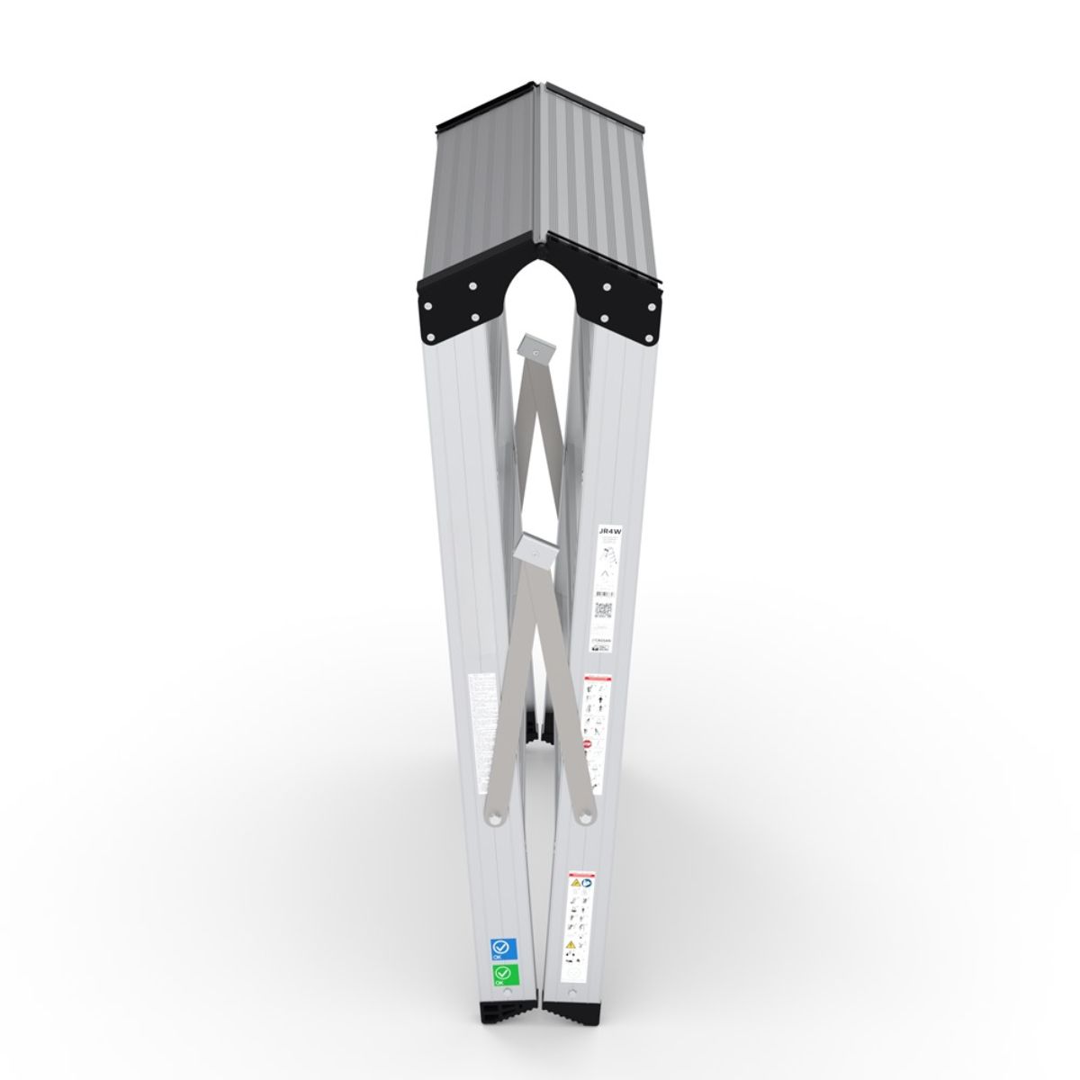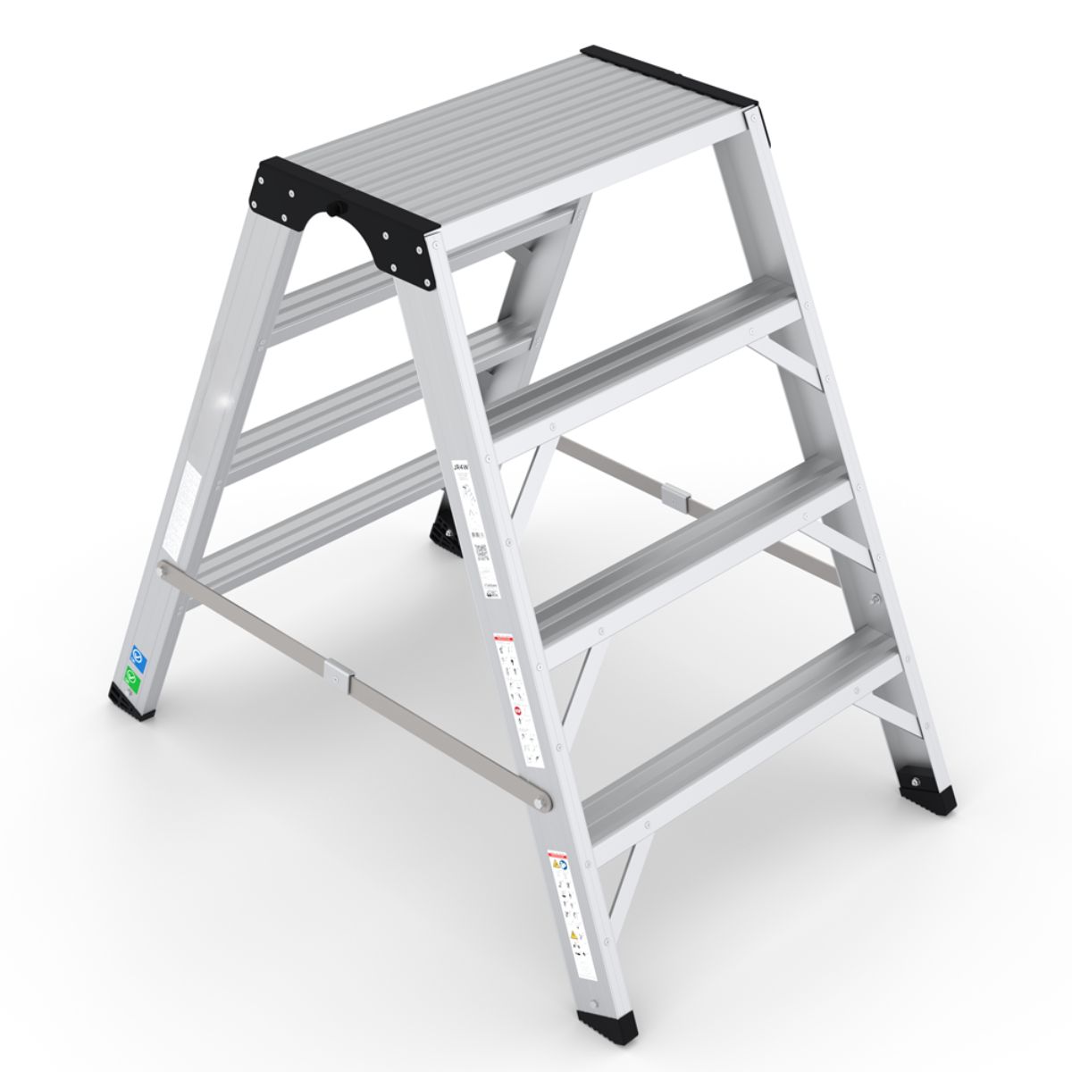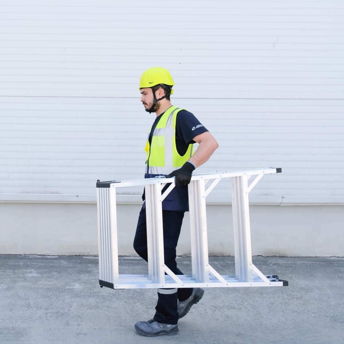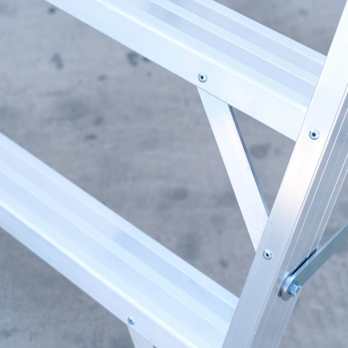 Den kraftiga säkerhetssaxen låser konstruktionen i öppet läge och förhindrar oavsiktlig hopfällning. Trots sin höjd fälls arbetsbocken snabbt ihop och är enkel att transportera. Arbetsbock bred 4-steg 1,0 m är särskilt lämpad för hantverkare, montörer och andra yrkesgrupper som kräver en kombination av säkerhet, räckhöjd och effektivitet.