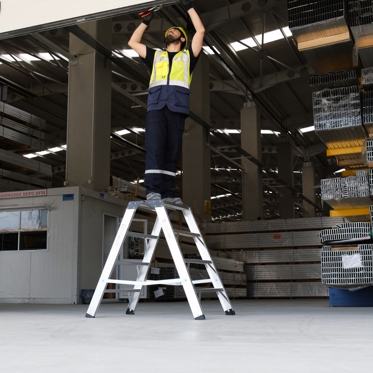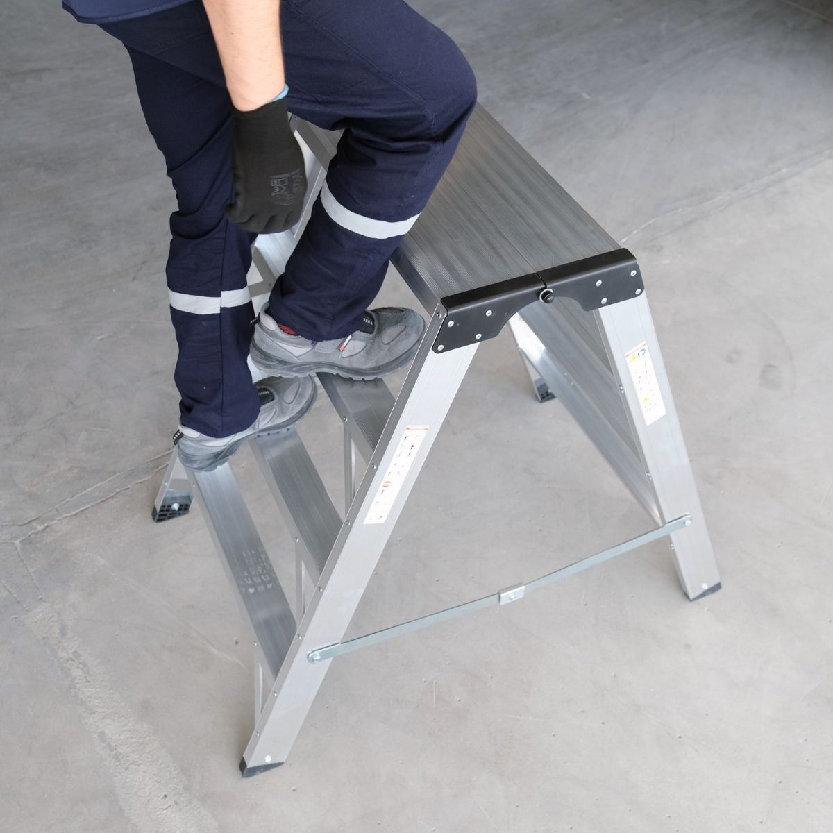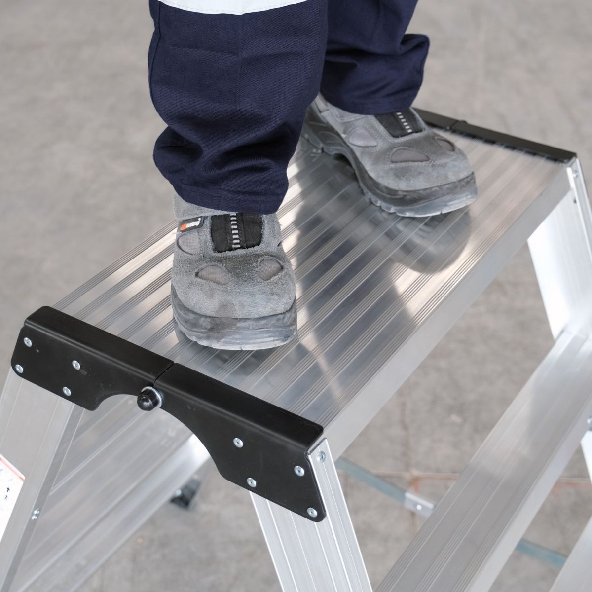 Den dubbelsidiga uppstigningen gör att du kan välja den sida som passar bäst för arbetspositionen. Stegen är räfflade för säkert grepp, och glidsäkra fötter säkerställer stabilitet på olika underlag. Detta ger trygg rörelse även när du behöver arbeta från flera vinklar.