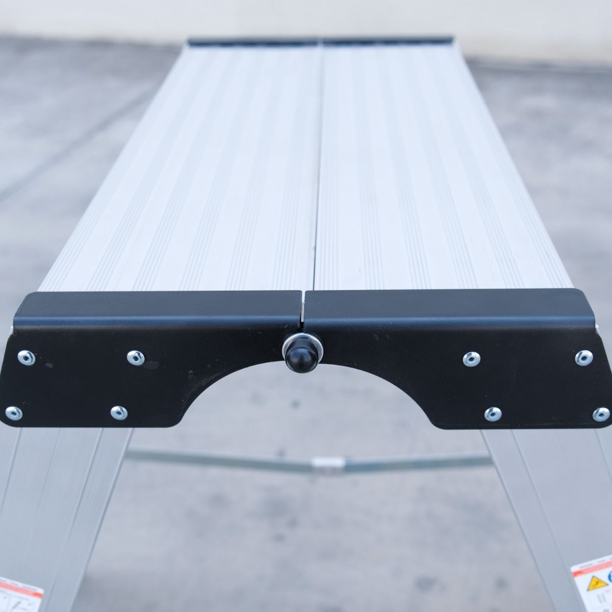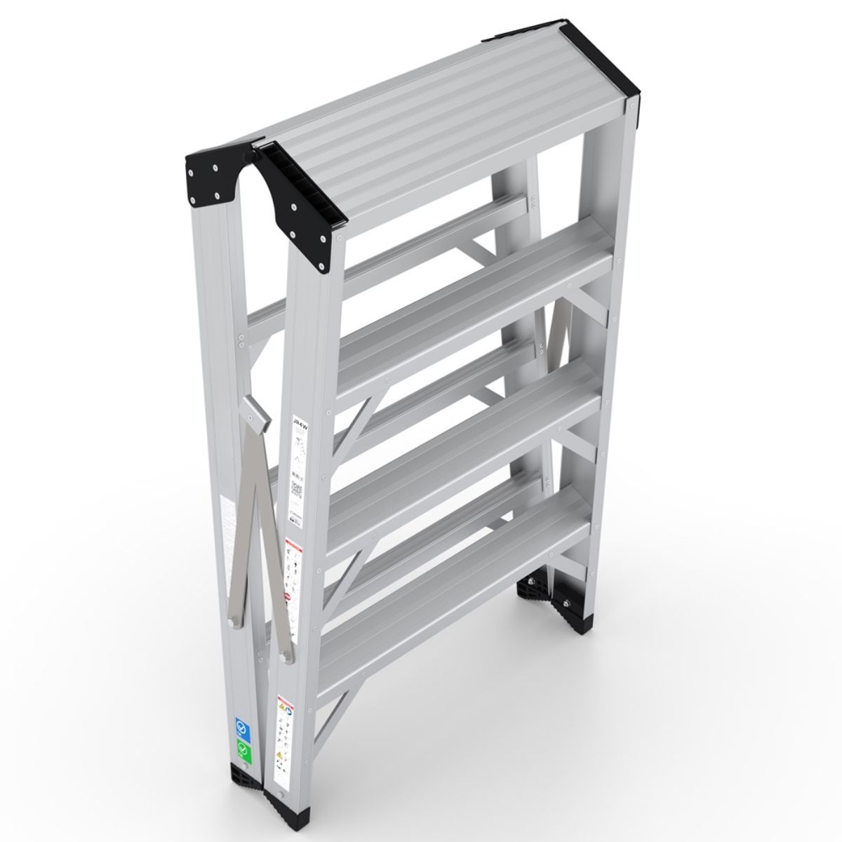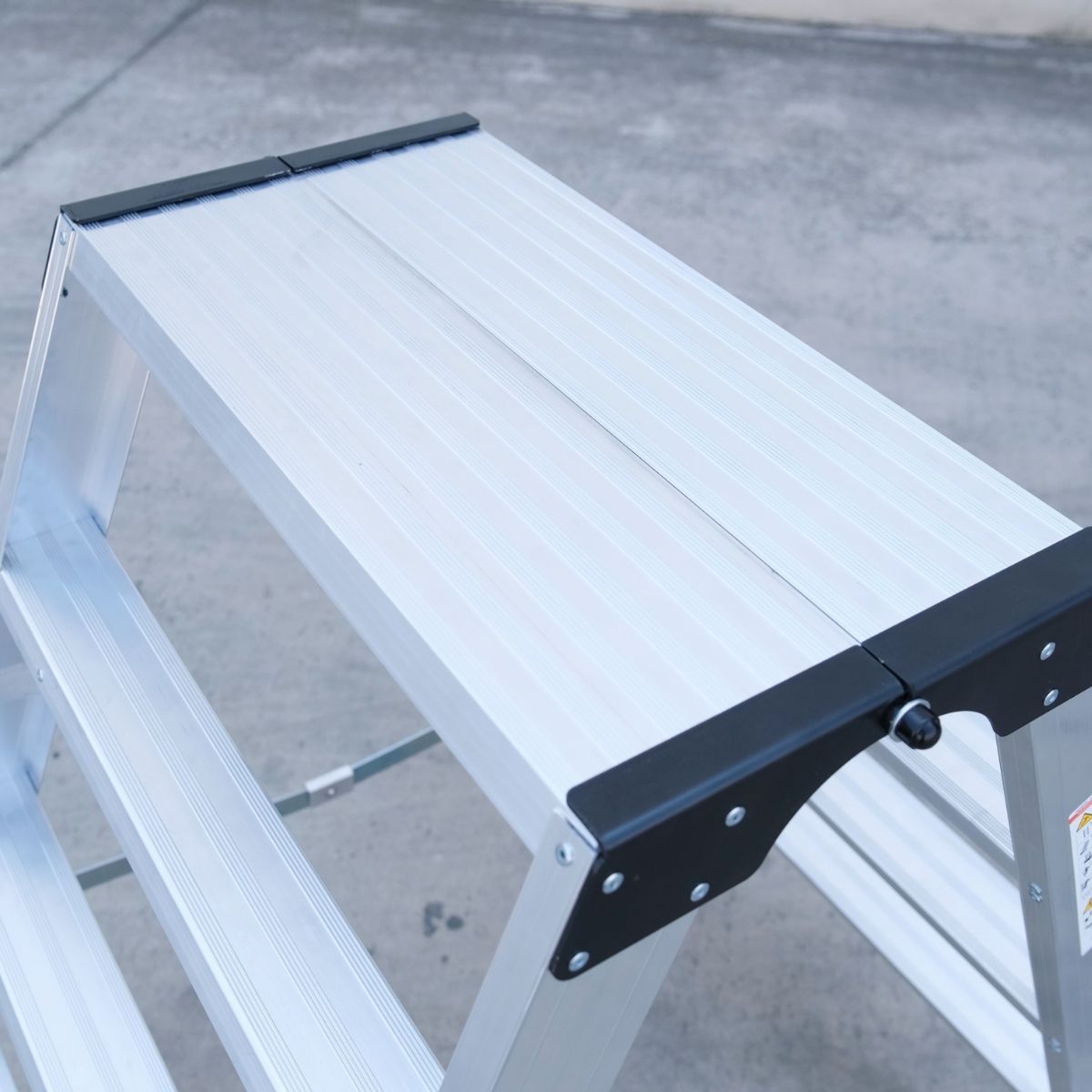 Den dubbelsidiga uppstigningen gör att du kan välja den sida som passar bäst för arbetspositionen. Stegen är räfflade för säkert grepp, och glidsäkra fötter säkerställer stabilitet på olika underlag. Detta ger trygg rörelse även när du behöver arbeta från flera vinklar.